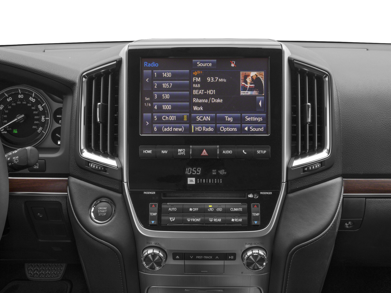 - Radio: Entune Premium w/JBL Audio & Navigation -inc: 9" high-resolution multimedia touch-screen w/split-screen capability and integrated backup camera display, AM/FM w/CD player, 14 JBL speakers including subwoofer, SiriusXM All Access Satellite Radio (3-month complimentary trial subscription), HD Radio w/iTunes Tagging, USB port w/iPod connectivity and control, vehicle information, hands-free phone capability, phone book access, advanced voice recognition, music streaming and Siri Eyes Free via Bluetooth® wireless technology, Entune App Suite includes Destination Search, Facebook Places, iHeartRadio, MovieTickets.com, OpenTable, Pandora, Yelp and Slacker Radio Access to SiriusXM data services is complimentary for 3-months. See toyota.com/entune for details.